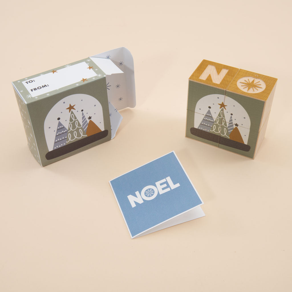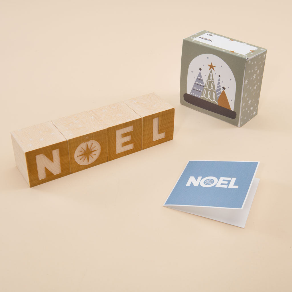 Bring Christmas cheer home for the holidays! Four heirloom-quality wooden blocks spell NOEL. Rearrange the blocks to reveal a magical snow globe scene, filled with Christmas trees. See snowflakes swirl on the remaining sides. This holiday gift doubles as festive decor and an interactive puzzle. A keepsake you’ll treasure year after year. Make spirits bright, block by block.