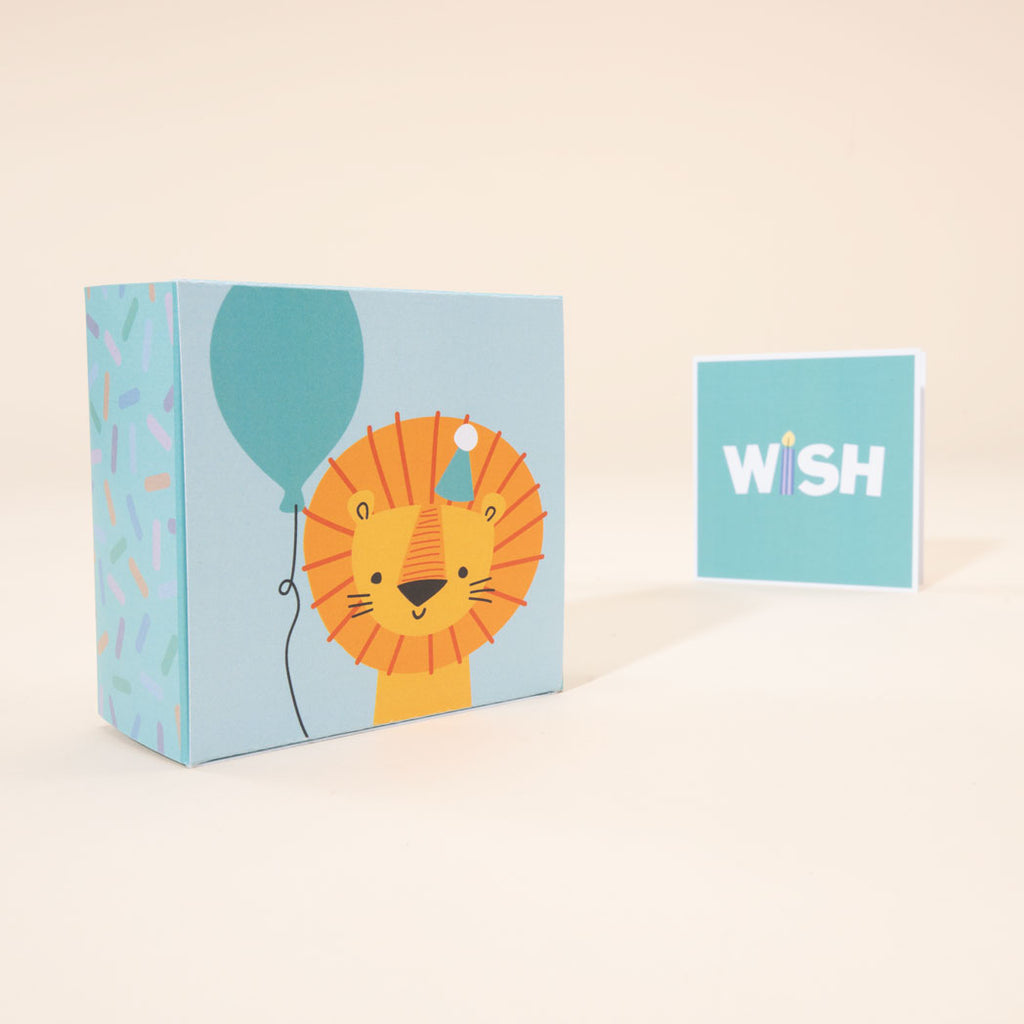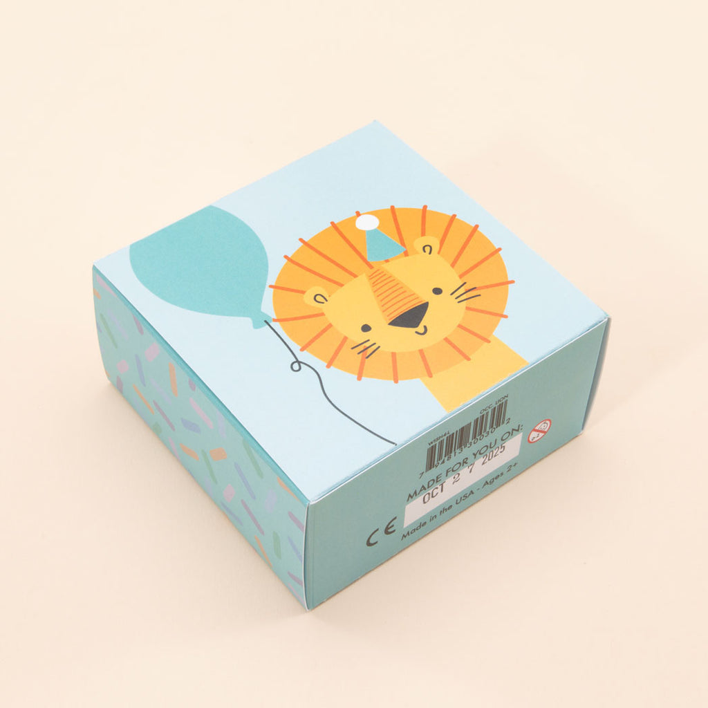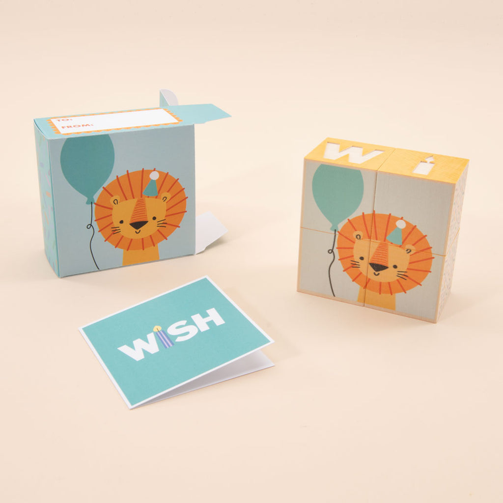 Roaring good fun! Dig the groovy lion in a party hat, holding his balloon. A wild celebration of color. Rearrange the blocks to spell WISH. See sprinkles on the sides. You’ll want to bring out these blocks for every birthday.